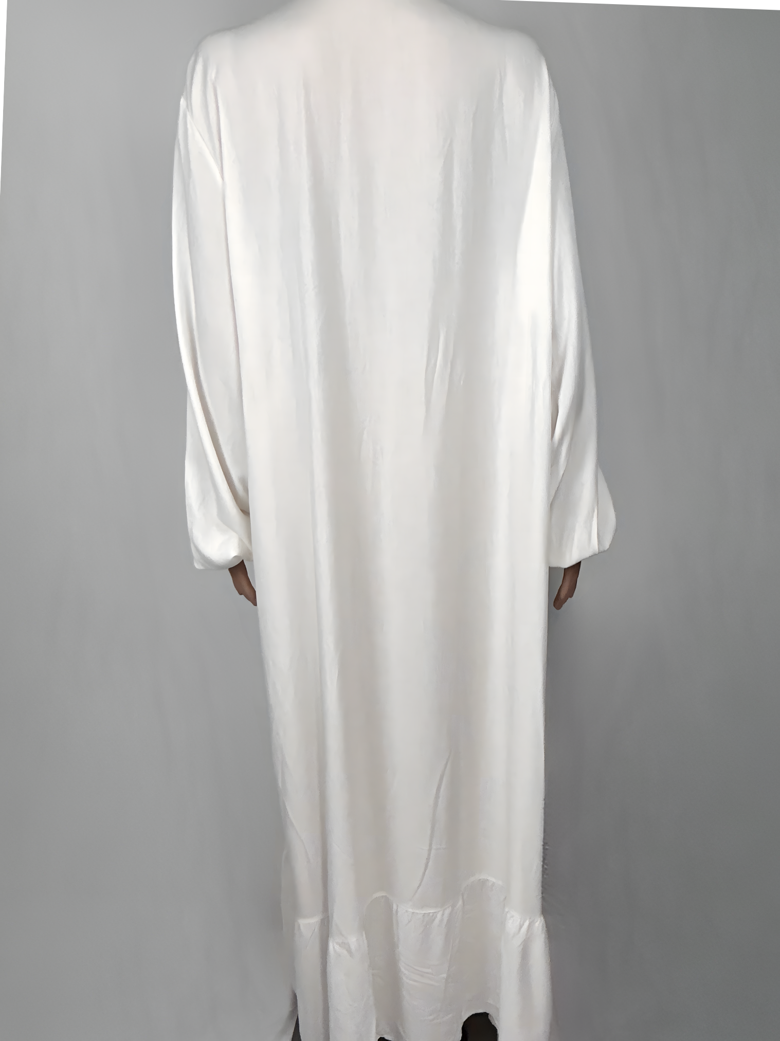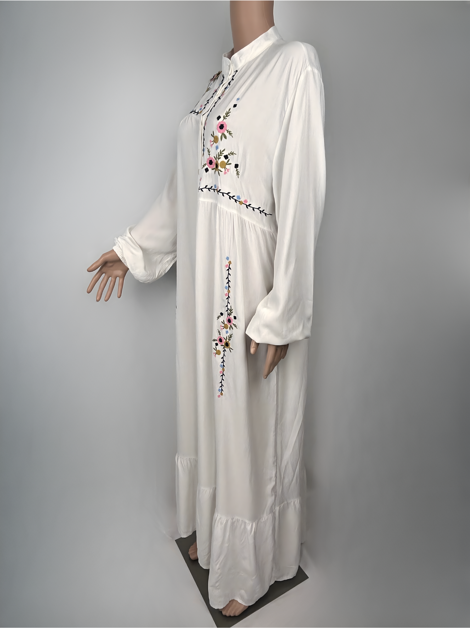 Effortlessly chic and timeless, this long white maxi dress is adorned with intricate floral embroidery that brings a fresh, feminine touch to any wardrobe. The button-down front and mandarin collar offer a polished, versatile look, while the relaxed long sleeves with gentle elastic cuffs ensure all-day comfort. A subtle gathered seam at the waist creates a flattering silhouette, and the softly ruffled hem adds a hint of playful movement. this dress is perfect for everything from casual brunches to special gatherings. Pair it with delicate jewelry and a light scarf for a gracefully modest ensemble you’ll love season after season.