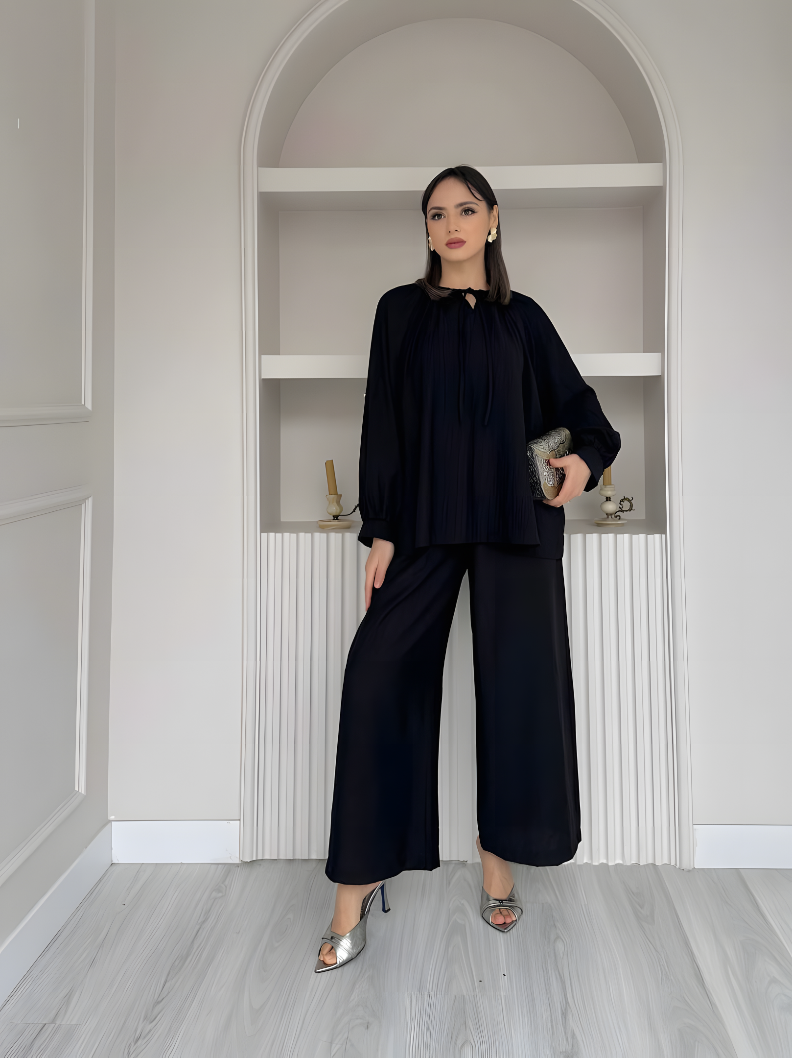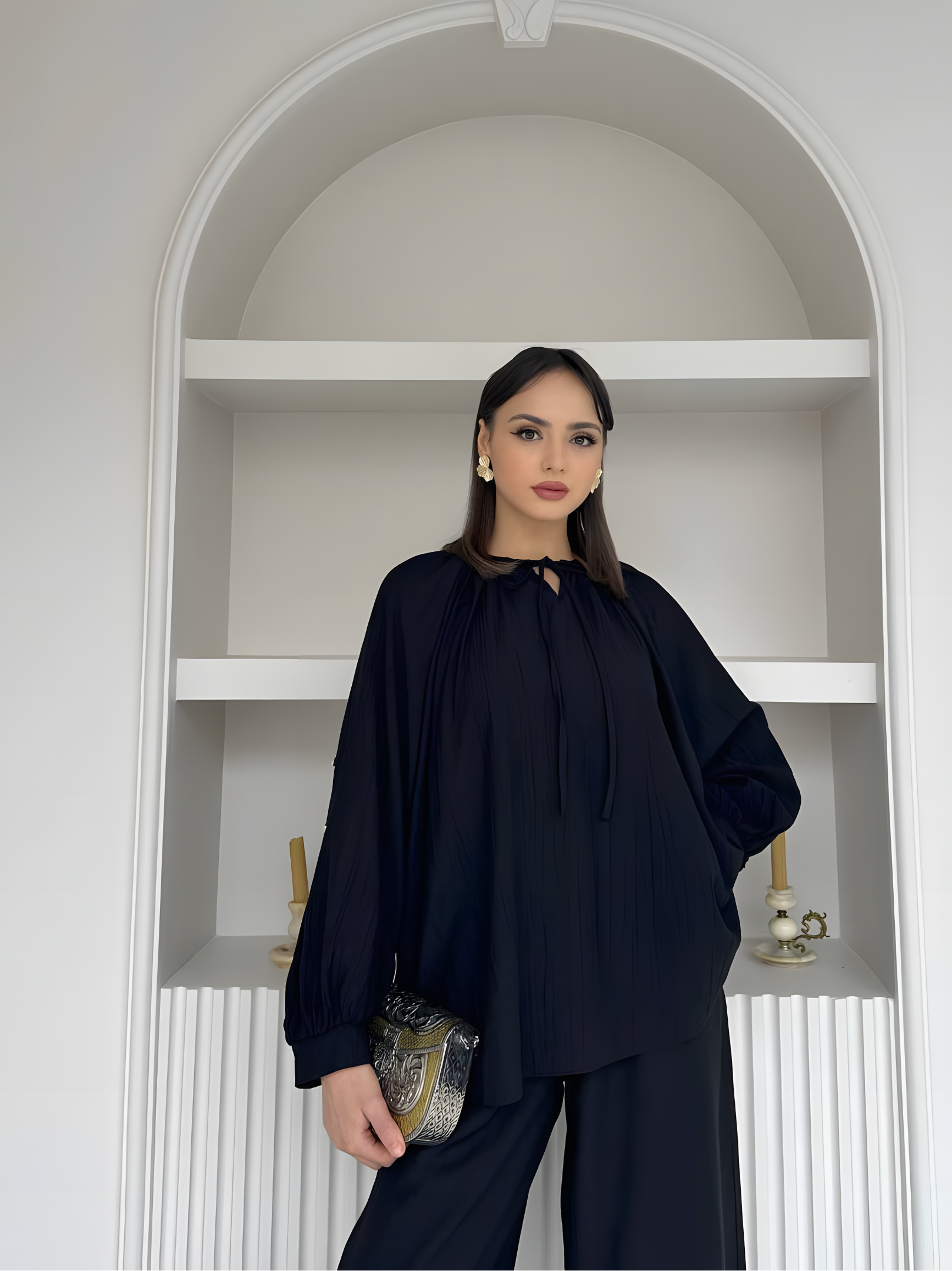 Elevate your style with our sleek Black co‑ord set crafted from luxurious Alis fabric. Designed for the modern woman who appreciates understated elegance, this ensemble features a gracefully relaxed top paired with impeccably tailored trousers. The premium Alis fabric drapes beautifully, offering both comfort and a refined silhouette, perfect for day-to‑day wear or special occasions. Embrace this effortless blend of modest charm and contemporary flair—your wardrobe staple reimagined.